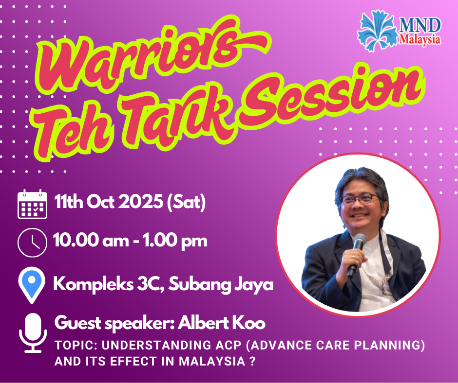 In our upcoming Warriors Teh Tarik Session #4, we will have a guest speaker, Albert Koo (MND warrior), to share on the topic on ACP (Advance Care Planning). The sub topics are: